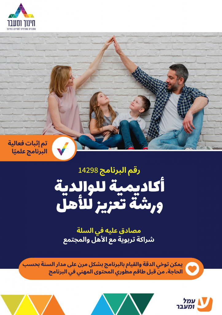 برنامج "أكاديمية الوالدية" تعرض ورشة تقوية جماعية، سيرورية وتركز على أهالي الطلاب في المرحلة الابتدائية والثانوية والغرض من البرنامج هو تعزيز الثقة بالوالدية، تقوية الرفاه النفسي والقدرة من خلال تعزيز مهارات والدية مثلى وكذلك تعزيز الشراكة والثقة بين الأهل والطاقم التربوي في الرحلة المشتركة من أجل الأطفال.